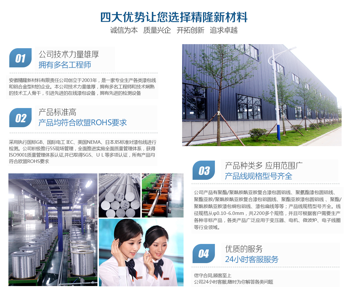 安徽精隆新材料有限責(zé)任公司位于安徽省池州市江南產(chǎn)業(yè)集中區(qū),是一家專業(yè)生產(chǎn)各類漆包線和鋁合金型材的企業(yè)。本公司技術(shù)力量雄厚,擁有多名工程師和技術(shù)嫻熟的技術(shù)工人骨干,引進(jìn)先進(jìn)的在線漆包設(shè)備,擁有先進(jìn)的檢測(cè)設(shè)備,采用執(zhí)行國(guó)標(biāo)GB、國(guó)際電工 IEC、美國(guó)NEMA、日本JIS標(biāo)準(zhǔn)對(duì)漆包線進(jìn)行檢測(cè)。公司積極推行5S現(xiàn)場(chǎng)管理,全面推進(jìn)實(shí)施全面質(zhì)量管理體系,獲得ISO9001質(zhì)量管理體系認(rèn)證,并已取得SGS、UL等多項(xiàng)認(rèn)證,所有產(chǎn)品均符合歐盟ROHS要求...... |